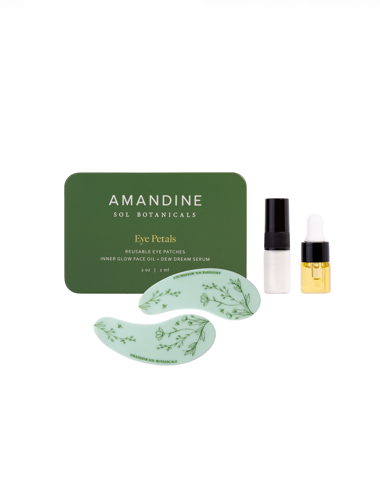 Eye Petal Kit comes with one set of medical grade silicone eye patches, 2ml Inner Glow Face Oil and 2ml Dew Dream Spray Serum, Essence and Toner.